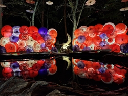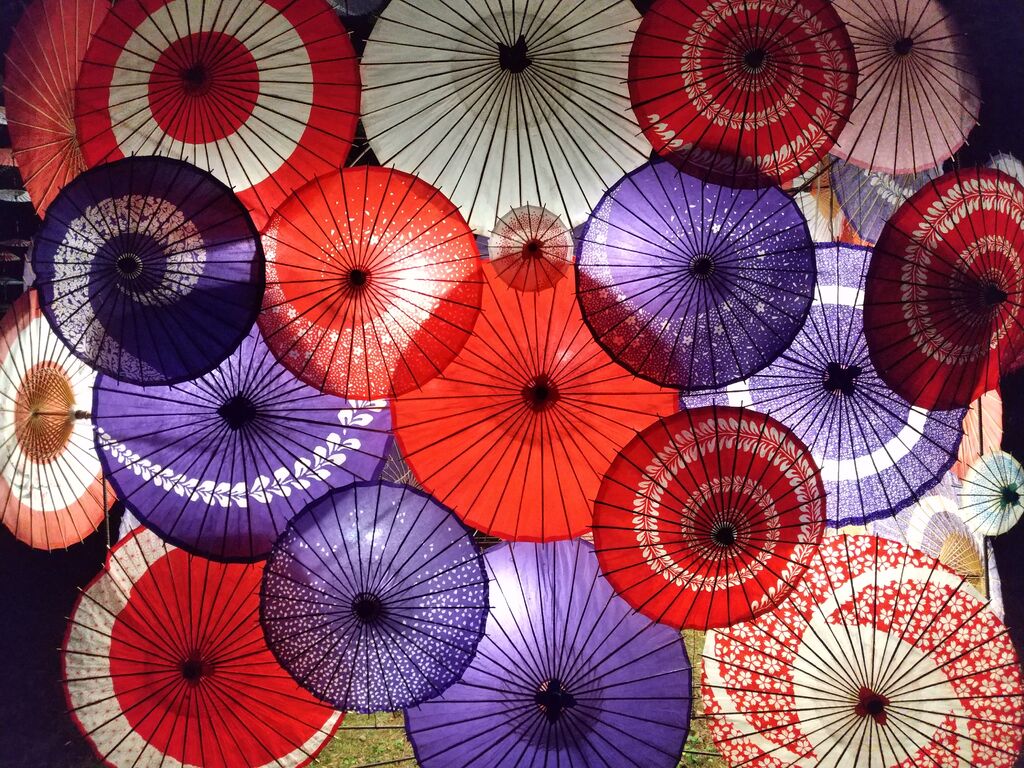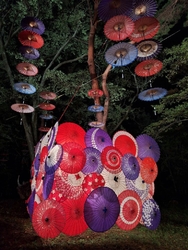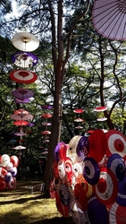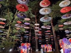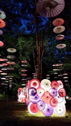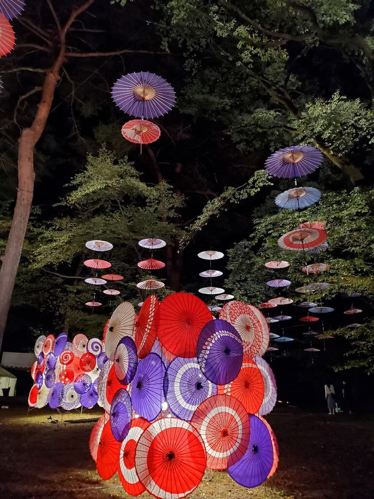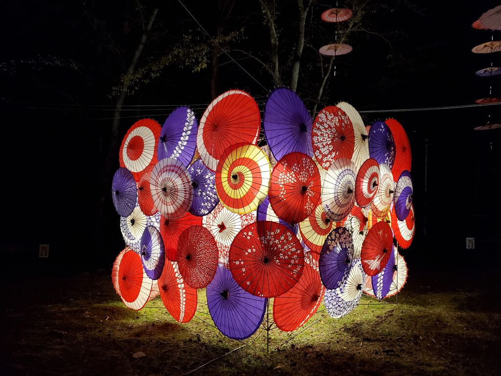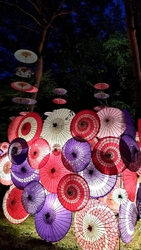 秋に開催される「月あかり花回廊」♪毎年のように出かけています。昨年は昼間に行き、緑の森に映えるカラフルな和傘を楽しみ、今年はライトアップされた夜に行ってきました。光で透ける和傘がとっても煌びやかで、とっても美しかったです。 (参加:2024/09/28)