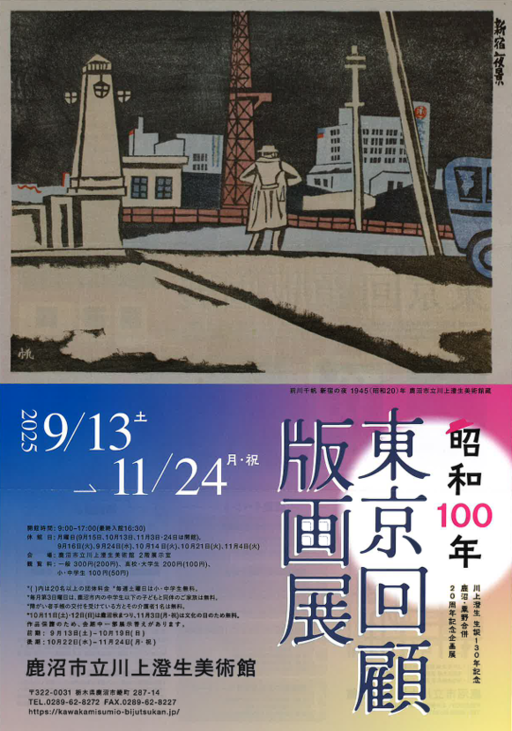 今展は、澄生たちの『新東京百景』に描かれた昭和初期の東京の街にスポットを当てながら、1980 年代・90 年代に制作された『東京百景』、現代若手作家による最近の東京をテーマにした作品を並べてご覧いただきます。版画家の眼を通して、都市や自然の景観、名所や旧跡、人々の営みを見比べ、変遷する東京の姿や変わらぬ情景をお楽しみいただくとともに、私たちが生きる「現在」を見つめ直す機会となれば幸いです。