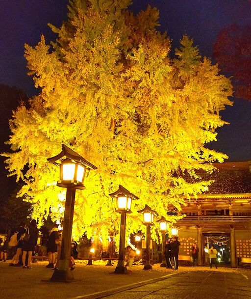 夕暮れとともに黄金色に染まる大公孫樹(おおいちょう)が、夜の静けさの中で幻想的に輝きます。