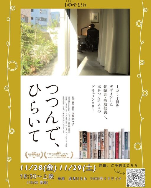 その仕事ぶりに、ものづくりの原点が見えてくるようです。本をつくる人々の情熱と知恵が詰まった映画です。本を愛する方、ものづくりに心を寄せる方に、もちろん書肆ひるねが好きな方に。ぜひご覧いただきたい作品です。皆様のご来場をおまちしております。