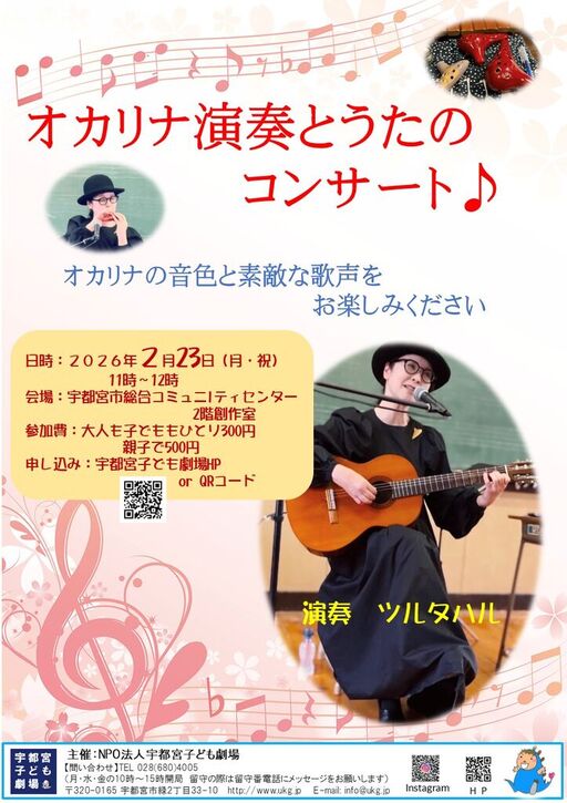 宇都宮市内でオカリナサークルを主催するツルタハルさんによる、オカリナ演奏と歌のコンサートです。