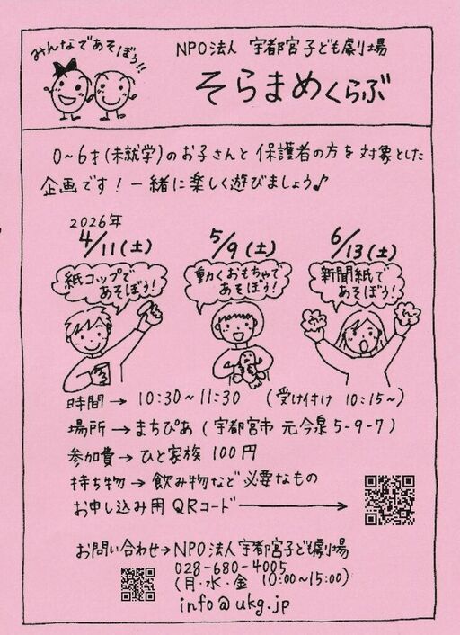 チラシのQRコードもしくは宇都宮子ども劇場のホームページの申し込みフォームから