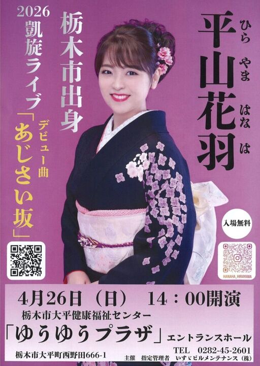 栃木市出身の平山花羽が凱旋ライブにて、デビュー曲 「あじさい坂」を披露いたします。