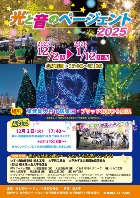 クチコミ18件 栃木市のイルミネーション [終了]光と音のページェント 2025 2025年12月02日(火)~2026年01月12日(月) お気に入り クチコミするキャンペーン中 基本情報 クチコミ 地図 ニュース 【ニュース】光と音のページェント2025 詳細(2025/11/19) 光と音のページェント2025の詳細です! マイニュースに追加 ニュース&レポートMENU 光と音のページェント2025 詳細(2025/11/19)