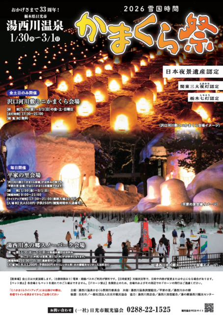 クチコミ16件 日光市のイルミネーション・体験・見学 [開催中]湯西川温泉 かまくら祭 2026年01月30日(金)~2026年03月01日(日) お気に入り クチコミするキャンペーン中 基本情報 クチコミ 地図 特集 ニュース 【ニュース】かまくら祭り チラシ(2026/01/16) かまくら祭り チラシの内容はこちらhttps://www.nikko-kankou.org/storage/post_file/20251028124748_%E3%81%8B%E3%81%BE%E3%81%8F%E3%82%89%E7%A5%AD2026%E3%83%81%E3%83%A9%E3%82%B7(%E4%B8%A1%E9%9D%A2).pdf マイニュースに追加 ニュース&レポートMENU かまくら祭り チラシ(2026/01/16)