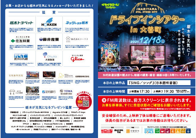 『ドライブインシアター in 大谷町』ご招待いただき、ありがとうございます 会場には 予想外に一番早く着いて 周辺エリアを家族で散策・買い物をし、会場にもどりました 久しぶりに行ったので何件か入ったことのない店にも入る時間がとれました 観賞中、エンジンをとめてしまうと予想より車内がとても寒くなってしまうので、たまにつけながら 持参したひざ掛けをかけながら観賞しました開始当時は 音声の雑音が気になりましたが途中から解消され 気にならなくなりました SING!!!!!は一度家族でみたことはありましたが、違った環境で体験したことは 家族の思い出が増えました! 物語終盤の内容に月が出ているのですが、本物の月とリンクし、とても素敵でした 学生含めスタッフの皆さま・協賛会社の皆さま、素敵な企画に感謝でいっぱいです お土産のサプライズにも感激!! ありがとうございました (投稿:2021/12/22)
