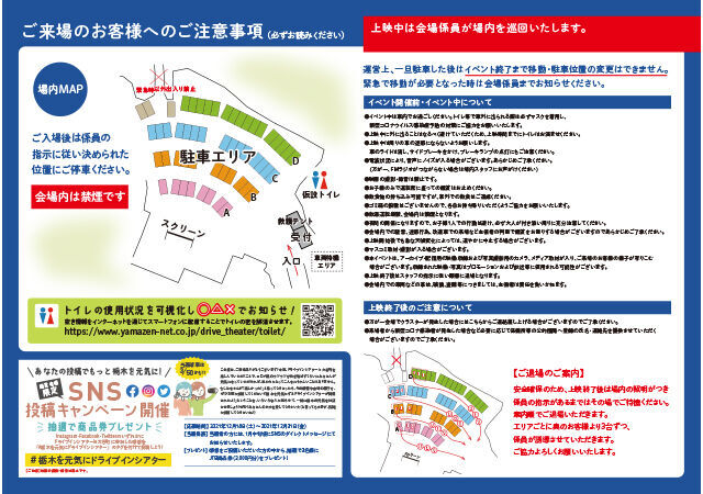 開催日前日にキャンセルの方が出たため繰り上げ当選のご連絡をいただき行ってきました!入退場の渋滞は覚悟でしたが、そんな心配全く必要なくスムーズでストレスフリー。トイレの混み具合が車内で分かる仕組みが画期的!無料で映画が観れて来場プレゼントもいただき、スタッフの皆さんの対応もよく、幻想的な大谷の壁面への投影も素敵でした。映画が始まるカウントダウンを隣の車のお子さんがきっと大きな声で叫んでいるであろう姿がチラッと見えてとても可愛かったし、周りを気にしない車での映画鑑賞もとても久しぶりで特別な時間が過ごせました。退場時、寒い中でスタッフの皆さんが笑顔で手を振ってくれる姿も印象的でした。ありがとうございました~! (投稿:2021/12/23)