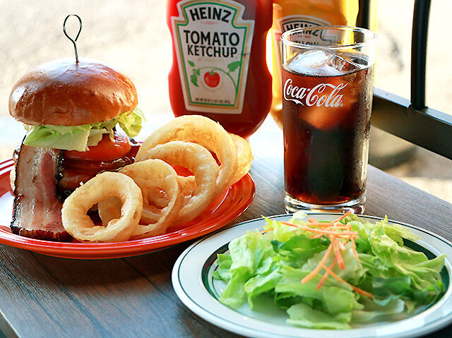 ハンバーガー+トッピング(玉ねぎ、トマト、チーズから1つ)・フライドポテト・ソフトドリンク(コカ・コーラ、コカ・コーラゼロ、メロンソーダ、ジンジャーエール、ウーロン茶、アイスティー、100%アップル