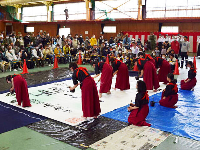 甲子園出場経験のある野球部だけでなく、様々な部活動があります。写真は、書道部の書道パフォーマンス。部活動でなくても、学習と何か1つのことを継続し取り組むことで精神的な柱を築きます。
