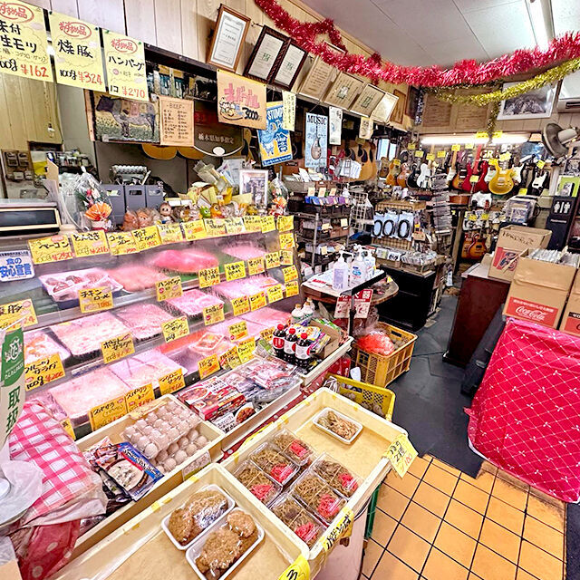 見どころいっぱい★お肉屋さんとギターSHOPの二刀流