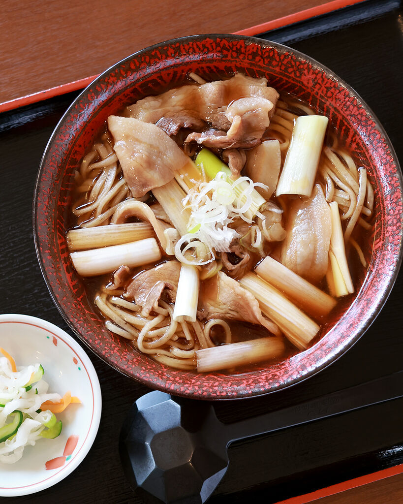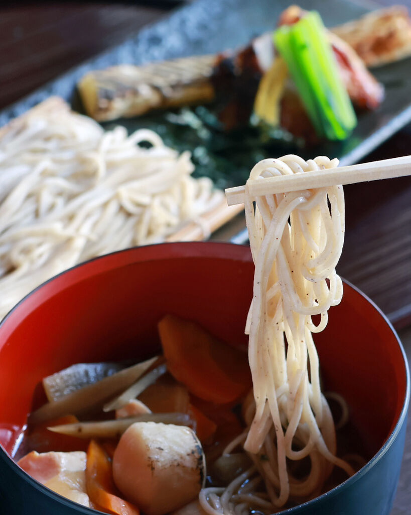 地元で栽培される玄そばを敷地内の製粉所から、挽きたて打ちたて茹でたてで味わえます。ちたけそばは、とちぎの伝統的な郷土料理。事前になすと一緒に炒めているので香ばしく、ちたけの強い香りと深いコクがしっかりとつゆになじんでいます。しっかり濃いめのつゆが冷えた身体にしみわたり、飲み干したくなるほどの旨味。歴史ある邸宅で味わうのも一興です。