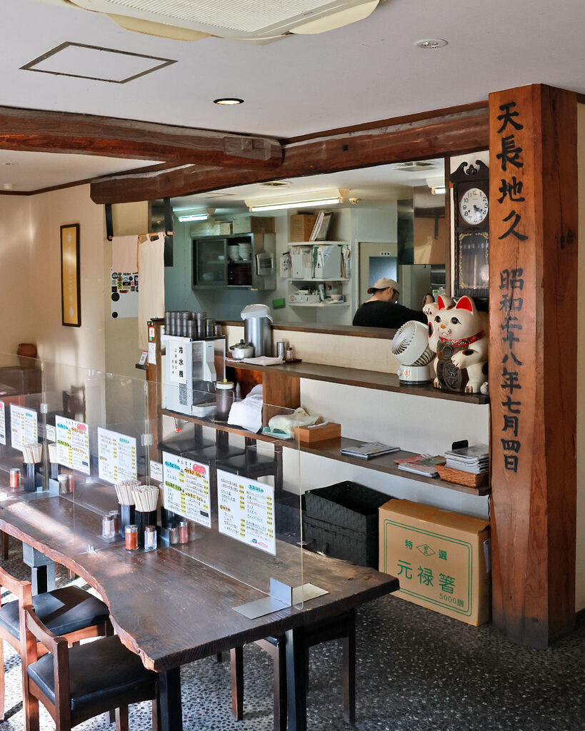 食券を購入しカウンター席へ。懐かしむ人にも初めての人にも、お腹と心を満たしてくれる一杯が湯気とともに現れます。麵とつゆは中沢製麺から仕入れ、長年親しまれたあの味が復活!つゆたっぷりのひたひたな天ぷらと、爽やかな岩下の新生姜が人気のトッピングです。足利店だけの新たな魅力も加わり、今までもこれからもファンの心をつかんで離しません。