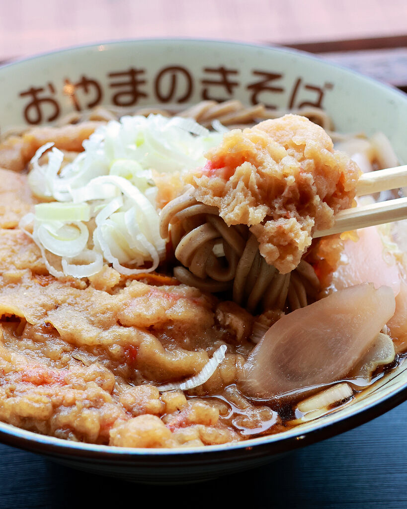 お店で打つそばは、少しだけ幅広でのど越し良し。サバやアジなどをブレンドした、ほんのり甘くて濃いめの自家製つゆにバッチリ合います!こちらのお店は、先代から変わらず白菜入り。食べ進めるとシャクッと瑞々しい食感がクセになります。揚げ玉やかき揚げが入った熱々のつけ汁に冷たいそばをつける食べ方は、県北地域で“ひたしそば”とも呼ばれ愛されています。