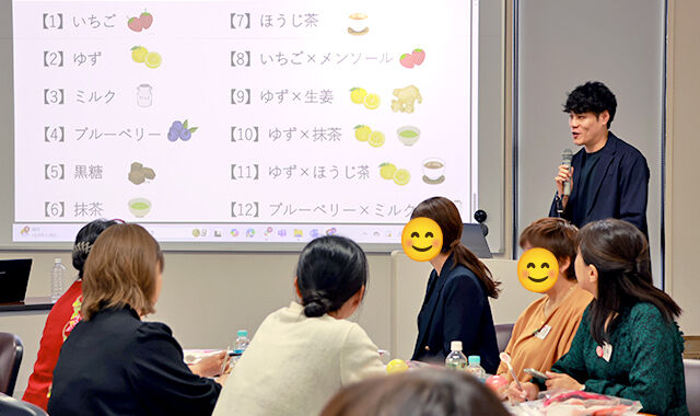12種類もあったフレーバーの中では、酸味や香りが良く高評価を得た「ゆず」人気が高かったです。黒糖やほうじ茶は、大人っぽく香ばしい味わいで好評でした。メントールや生姜などをかけ合わせたミックス系も手応えあり!ですね♪