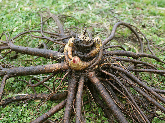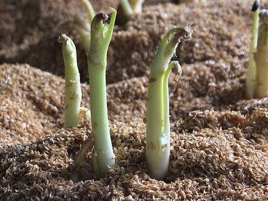 磯さん「この根っこを、暗いハウスの中で、優しくモミガラをかけて温度を調整してやると…根っこのまわりの小さなコブから、食べられる「うど」が何本も生えてくるんだよ!」