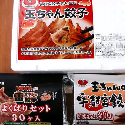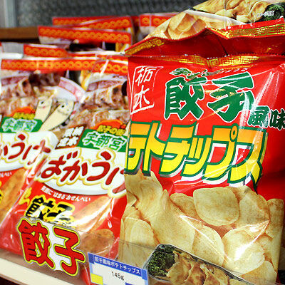 ばかうけ餃子味 388円・餃子風味ポテトチップス 350円(左)・ポテトチップス宇都宮焼き餃子味 525円(中)・玉ちゃんの宇都宮餃子 1,050円(右)
