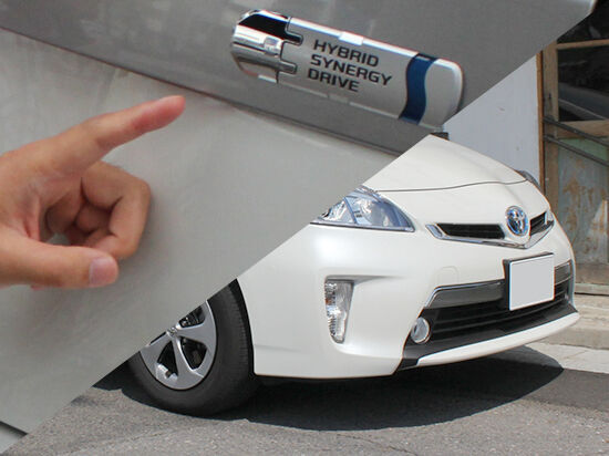 プリウスPHVのロゴはプリウスとちょっと違うんです。ロゴの左側がコンセントの形をしています。これがプラグインハイブリッドの証。フロントグリルも少し違うのをお気づきになりましたか?
