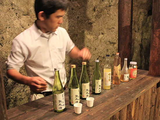 夏の暑さを避け、次にやってきたのは、銘酒「東力士」の蔵元、島崎酒造さん。映画のロケ地としても使われた低温貯蔵庫、「どうくつ酒蔵」の見学にやってきました。第二次世界大戦末期に計画され、実際には使われなかったいうこの洞窟。年間平均気温は約10度、720坪のスペースに約8万本を貯蔵しているんだそう。まるで探検にきたようで、ワクワクしてきました!