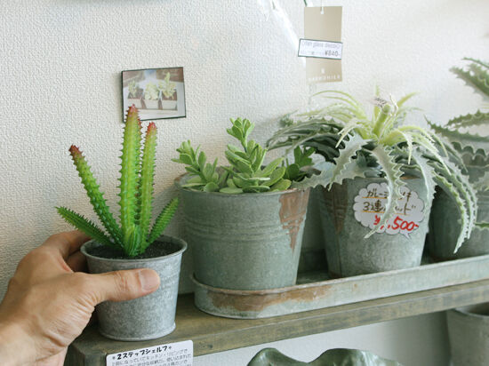 ガーデニングコーナーは、観葉植物やかわいい多肉植物が元気に・・・っと思ったら!なんと精巧なレプリカ!お手入れいらずだし、ちょっとした場所に置いておくのもイイかも!