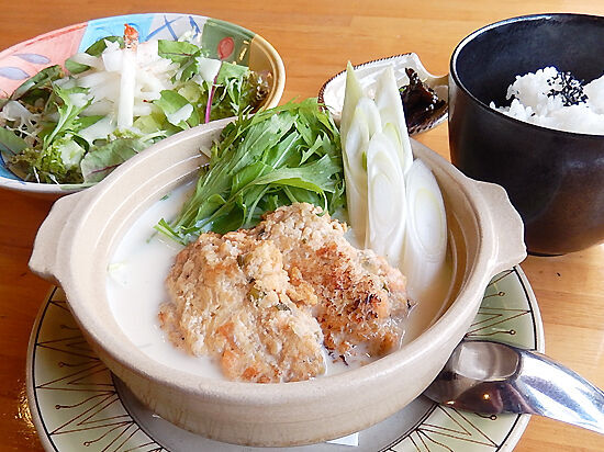 こんりゃま~、ホッカホカの鍋だんべ~!ベジブロスと呼ばれるあらゆる野菜からとった旨みコンソメと牛乳を合わせたスープに、県産の野菜とヤシオマスのつくねがどーんと入っているんだわ~。つくねは軟らかくて魚の風味とセージの香りが効いていて、うんまいよ!新米ご飯をスープに入れてリゾット風にもできるし、かあちゃんあっという間にペロリと食べちゃったよ!梨のサラダは斬新だね~。ルッコラなどの風味のあるハーブや葉物野菜と、甘くてシャリシャリの梨の組み合わせが新鮮だなぃ!自家製ハーブドレッシングがこれまたうんまいよ~。