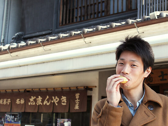 冨士屋本店前で、名物のじまん焼きをパクリ!熱々のあんがぎっしりです~!絶妙な甘さと、パリっとした皮がクセになりそう♪うぐいすあんや、小倉ソフトも人気だそうで、ズラリとお客さんの行列ができることもしばしば♪