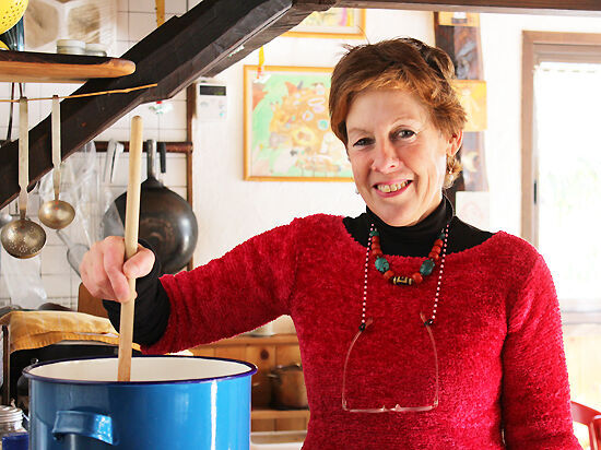 「蓋の布は、中身の色と合わせて種類ごとに変えています。合う柄がない場合は、自分でペインティングしています」とピアさん。工房のお鍋一つとっても絵になるような“暮らし”そのものがステキです☆