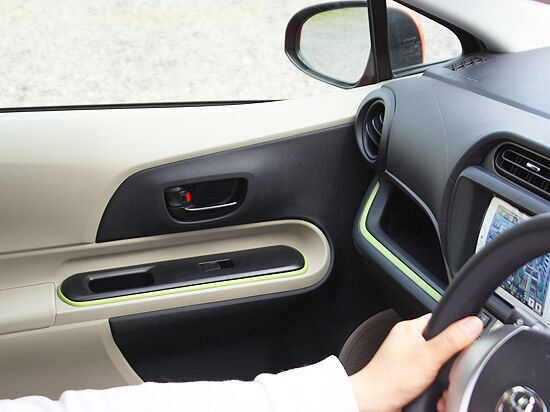 AQUAのインテリアはグレードごとに設定された全5色。Sグレードの標準色はフレッシュグリーン☆穏やかな若葉色で、室内全体が明るいトーンに。カラーによってシート表皮の模様も変わります!