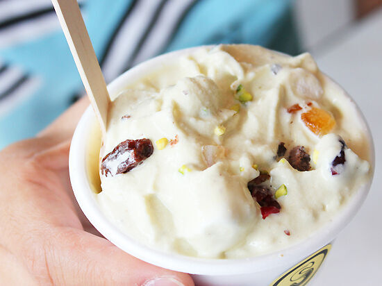 透き通るような存在感のこちら。店主の「夢に出てきた」ことから誕生したという、フローズンヨーグルト愛の結晶のようなこのメニューは、バニラヨーグルト×フローズンヨーグルトのハーモニーがたまらなくおいしいです。一度の来店で数種類を食べる人もいるほど熱烈ファンも多く、1人で来店される男性も多いそう。ボクもまた来よっと♪