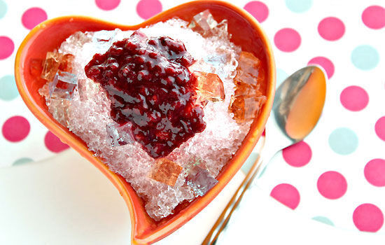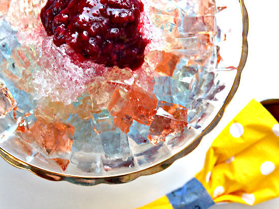 お子さま用の小さめの器に氷を削って、用意しておいたゼリー(3色)をトッピング。藍ベリーのラズベリージャムをたっぷりかけて召し上がれ♪