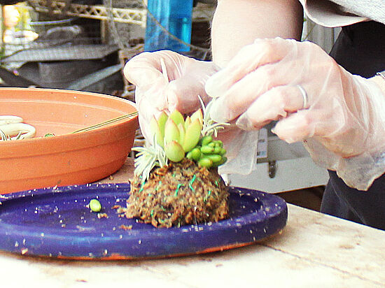 苔の土台にいろいろな多肉植物の小枝をさして、埋め尽くしたら完成!淡い緑、濃い緑、お花のような形や細かい葉など、さまざまな多肉植物が入り混じって、ステキでしょ☆水やりは、植物がしんなりしてきた頃、お水を張ったバケツにブクブクしずめて土台にたっぷり水を吸わせればOK!枝が伸びてどんどん成長するので、伸びた枝を切って、さらに土台にさしていけばボリュームアップできるそう。育つアートなんて、とっても楽しみ!