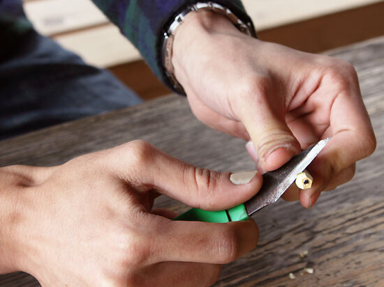 鉛筆作りで使われる小枝は、すべて森の木々を剪定した時に出るものだそう。桜の木、ヤシオ、ナラ…森には100種類以上の木があるそうで、森を保つための管理は大変なのだなと、しみじみ。無心で削っていると、遠くからモズの声が聞こえてきました。普段なかなか触れることができない大自然の心地よさを、体いっぱい感じることができました!