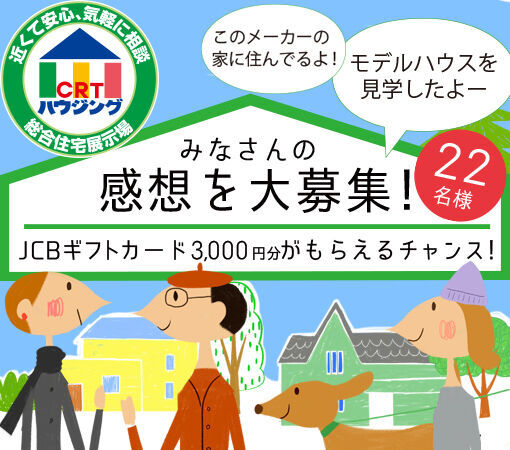 CRT宇都宮西展示場にある22棟のモデルハウスを見学した感想や、「ここが良かった!」という見どころを投稿してネ♪投稿された感想の中から、各メーカー(22棟)ごとに感想大賞を発表!選ばれた22名さまに、JCBギフトカード3,000円分をプレゼント!さらに、栃ナビ!からご投稿いただいた方全員にステキなプレゼントあり☆