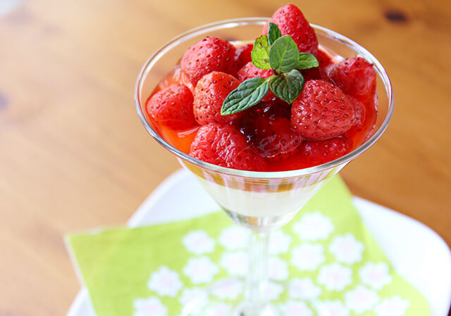 コース料理の最後に選べるデザートのひとつ。ホワイトチョコのムースに相性ピッタリのいちごのコンポート。いちごのデザートは今だけなので、ぜひチョイスしてみて!