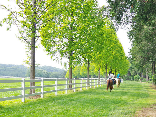 なだらかな丘と春の青い空。美しい景色が広がる、雄大な那須野ヶ原で乗馬体験ができます。必要なものはレンタルして、思いきって挑戦してみて!とっておきの優雅な休日が、待っています。