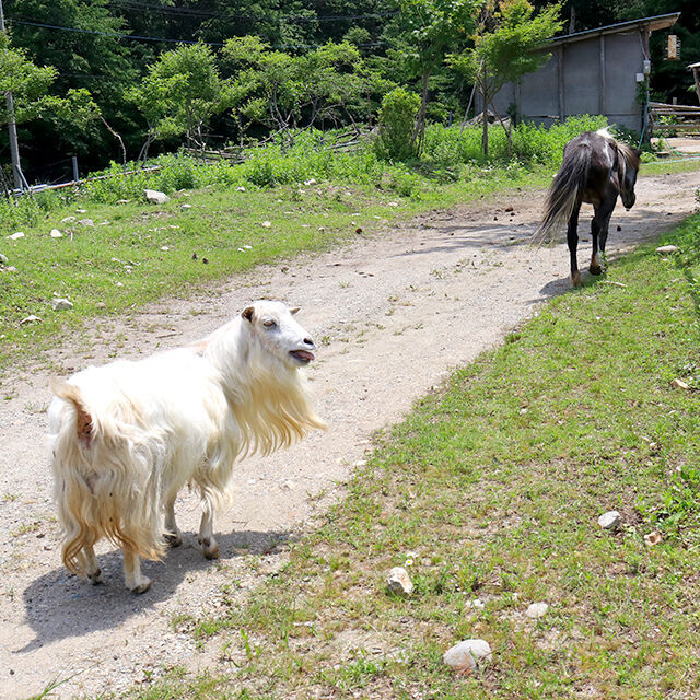 【昼】宿の外のお庭や柵の中を歩いたり、生えている草をムシャムシャ食べる。