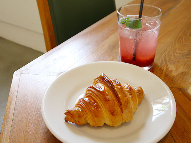 魅力的なメニューと見た目の美しさ。そして食べたときの衝撃!思わずかじりつきたくなるクロワッサンを、店内でいただきます。表面はサクッと中は驚くほどしっとり。職人の技が織りなす何層も楽しめる食感に驚き!