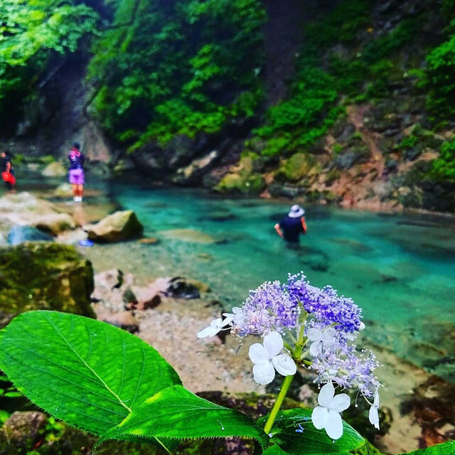 緑の木々の合間にある渓谷は美しいエメラルド色!天然のブランコにのったり、澄んだ空気の中での水遊びは心に残る思い出に。