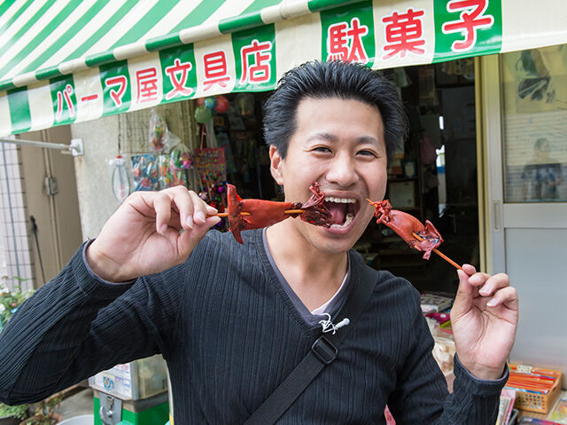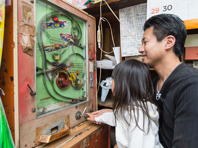 学校帰りに何枚かの10円玉を握りしめて駄菓子屋さんに寄り道した記憶は、きっとパパさんたちはお持ちのはず!コチラのお店は、そんな昔ながらの駄菓子屋さんです。前の道は、以前は歩行者天国になるほどにチビッ子たちで賑わったそう。もちろん今でも子どもたちに人気!パパも娘さんも大興奮です!
