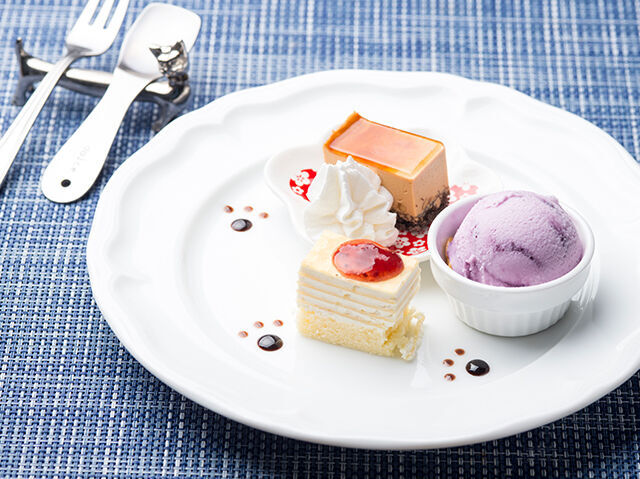 プチ感がかわいいケーキとジェラート。ネコちゃんが歩いたようなチョコソースの足跡は、もったいなくてケーキに付けずにそのままにしておく方も多いそう。