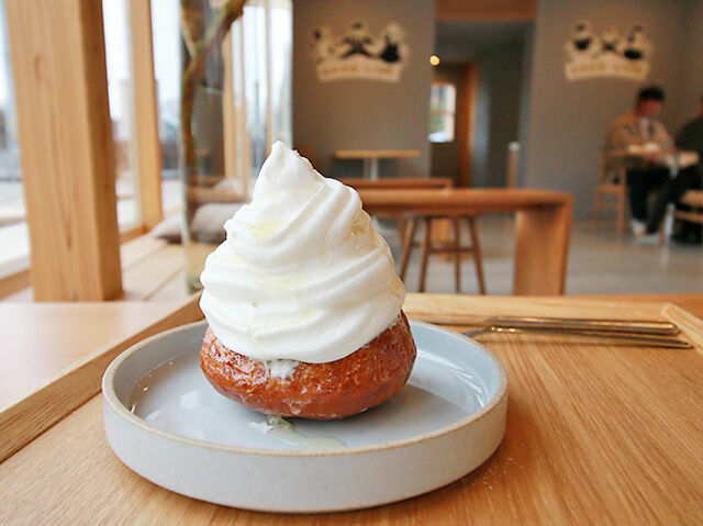 ひと口目からしあわせになれるカフェ限定のスイーツ。温かいドーナツの上に、アイスクリームとふわふわのホイップ。さらにオリーブオイルと岩塩の組み合わせは感動もの!