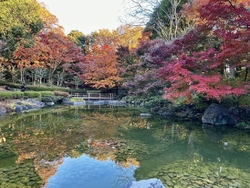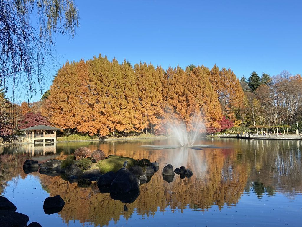 掲載:2025/12/01今年もメタセコイアの紅葉が見頃を迎えました。15時過ぎに訪問すると、夕日の光に照らされ、黄金色に美しく輝いていました。池の水面に鏡の様に映り、絵画の様でした。モミジはピークを過ぎていましたが、鮮やかな赤いモミジが多いかえで橋周辺では写真を撮る方々で賑わっていました。夏の猛暑の影響で傷んでしまった葉もあるそうです。外国人の方も以前より多く訪れているように感じました。紅葉を見て美しいと感じるのは世界共通ですね(^-^) (訪問:2025/11/24)