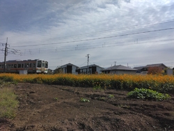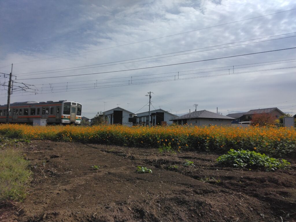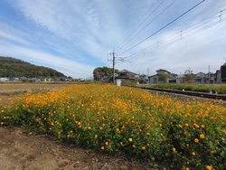 綺麗なキバナコスモスの群れ(((o(*゜▽゜*)o))) 踏切待ちだったので、電車も併せて撮りました°˖✧◝(⁰▿⁰)◜✧˖° てくてく歩いて、山々を眺めると、赤・オレンジ・黄色・緑... 紅葉が美しいo(*////▽////*)q 心のシャッターも、忘れずに切らないと...(●ˇ∀ˇ●) (訪問:2025/11/11)