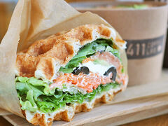 評判のハーフカツサンドセットを。上を見るとオレンジ色のお花ようなライトがノスタルジー。到着したセットのコーヒーが映し出していました。サラダにはカボチャとさつまいもの素揚げやトマト、ブロッコリーも乗り栄養満点。初めてのカツサンドは2センチくらいの厚さで(思わず家で測りました(^^;)、柔らかなヒレカツにピッタリの濃いソースとマスタードソース、しっとりしたパンがたまらな〜い♪サクッとした部分も美味しさアップ。夢中でバクバク食べました。家族に買ったおみやげ勝サンドにも手を出してしまいそうなので、早めの帰りを願います。