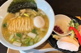 とあるラーメン情報雑誌に掲載が有り、気になっていたお店です。お店は住宅街にあり少し分かり難い場所ですが、看板が有るため迷わず行き着けました。入り口の食券機で購入するスタイルで、店員さんがオススメは食券機上段の写真付きとの事で、まぜそばと特製鶏塩ラーメンに餃子(ラーパスで+2個)を注文。まぜそばは牛肉タップリに紅ショウガなど他店ではお目に掛かれない感じがします。味わいはなんとなく牛丼的な甘めさがあり、ナッツの香り食感に紅ショウガが良いアクセントになっていました。別皿でフライドガーリック、レモンがあり味変も楽しい!更に半ライスが付いてくるため、まぜそばの残り肉ダネに混ぜてボリュームも満点です。塩ラーメンはアッサリスープに細ストレート麺が良く合っていました。お店の雰囲気・店員さんの接客も良く次回お邪魔するのが楽しみなお店です。