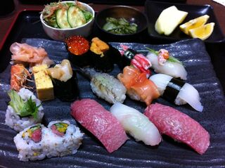 和食屋を営む友人夫妻とMY GODさんの4人で久~しぶりの訪問。夜7時前に到着すると10席ほどあるカウンター席に空きが無くテーブル席に着き生ビールからのスタート。おつまみに刺身の盛り合わせ(3人前)を注文すると見事な7点盛りが到着。全て美味しいのは当然ですが鯛が甘くて上品な味があり、鯛ってこんな味なんだ!今まで食べてきたのは何鯛?って感じ。その後アサリの酒蒸しとキンキの焼き物を注文。どうみてもハマグリでは?と思うような大きなアサリにお酒も進み白ワインをボトルで注文。1時間ほどするとカウンター席が空いたので移動しお鮨タイムです。旬の貝類を軸にホタテ貝、ツブ貝、平貝、コハダ、車海老、赤身、中トロ、そして〆に好物のかんぴょう巻。かんぴょう巻は椎茸とわさびが入っていて何個でも食べたい美味しさです。何度か来ているのでおおよその値段は理解しつつも価格記載がないお寿司屋さんはちょっと不安ですね(笑)お鮨は基本的に2貫づつですが1貫づつでも握ってくれると思います。しゃりは小さ目なので色々なネタを食べたい人でも沢山食べられますよ。(お支払いも比例して沢山になりますが・・・)これだけ質の高いお寿司屋さんはなかなか無いと思いますがその割にお値段は良心的かと思います。