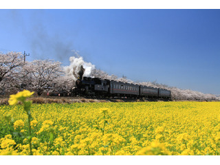 桜と菜の花の中を、蒸気機関車が走ります♪