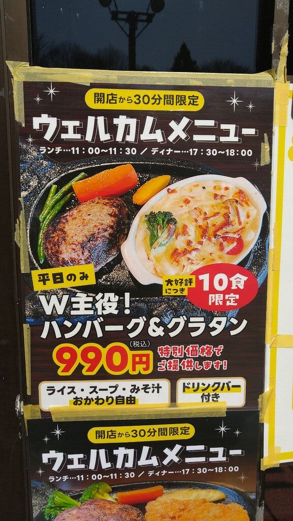 やっと...やっと食べてきました♪平日限定・10食限定のハンバーグとグラタンランチ。¥990(税込)は庶民の味方ランチ。メインのハンバーグには『雑穀米・豚汁』で、グラタンには『パン・コーンスープ』と、和食&洋食を同時に楽しめました!!!ドリンクバーも付いてくるので心躍りました。各テーブルにセッテングされているタレを沢山かけて食べて、身も心も多幸感に浸ってきました。帰りには栃ナビポイント交換で、タレ&ドレッシングを頂戴し至れり尽くせり。全身嬉しくお店を後にしました。 (訪問:2026/03/05)