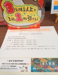 3名以上のグループで利用すると1枚くじが引けるキャンペーン中でした。小吉だとフード100円引き券がもらえ、その場で使えるとのことでした。大吉だと室料が無料になるクーポンがもらえるそうで太っ腹です。 (訪問:2025/12/12)
