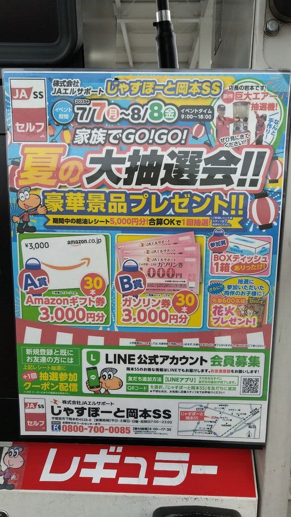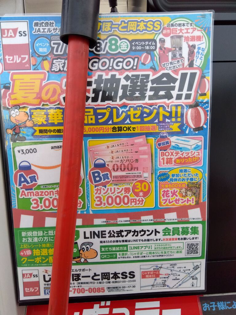 お得にガソリンを給油出来てよく利用しています。LINEの抽選券と、¥5000分のレシートで2階くじをひいて来ました。残念賞ですが、BOXティッシュを2個いただいて私的には大満足です。定期的にお楽しみ抽選券の配布があるので、これからも楽しく利用したいと思います。 (訪問:2025/08/07)