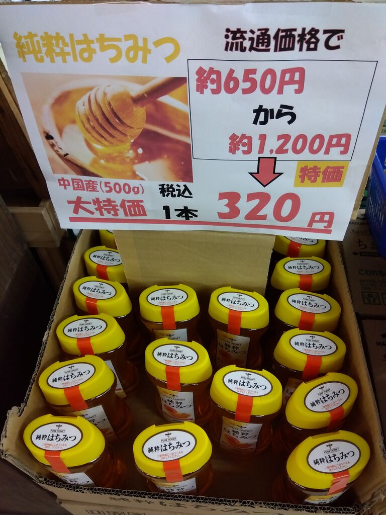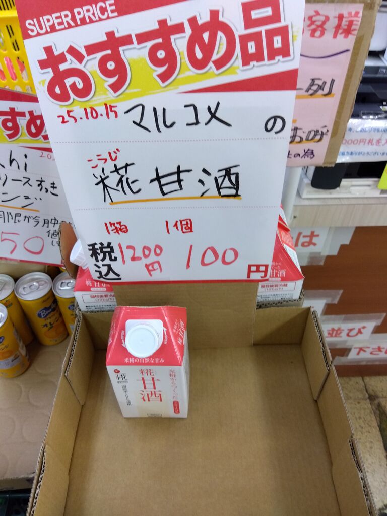 お野菜を買い出しにおじゃましましたら素敵なお買い得品を発見〜☆純粋はちみつがた〜っぷり500gで¥320 & 糀甘酒500ml 1パックがなんと¥100な〜り〜☆甘酒は賞味期限が間近ですが¥100はうれしすぎです〜(≧▽≦)♪そうそう水菜がなんと1袋 ¥38 でしたぁ!他にもお買い得なお品がモリモリ〜☆また楽しみにおじゃましま〜す(^∇^)ノ♪ (訪問:2025/10/09)